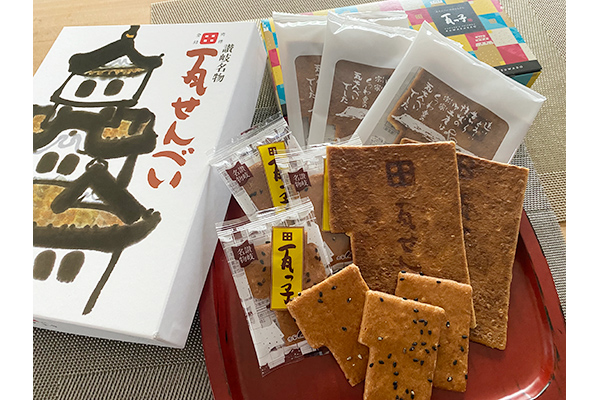 丸亀市観光協会が推薦する「丸亀城瓦せんべい」は、丸亀城の瓦をモチーフにした堅焼きせんべいです。黒糖の風味と、堅焼きならではの歯ごたえが特徴です。