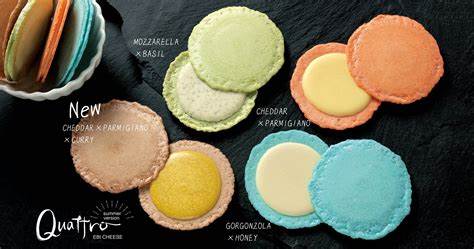 志満秀の「クアトロえびチーズ」は、4種のチーズをサクサクの海老煎餅でサンドした、まるでマカロンのようなおせんべいです。ほんのり塩味がきいた”えびせんべい”にコクのある”チーズソース”を挟みました。