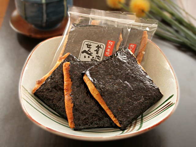 - 海苔煎餅は、薄焼きでパリッとした食感が特徴です。海苔の風味と香ばしさが、口いっぱいに広がります。