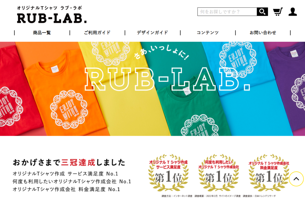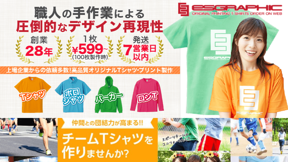 豊富なTシャツの種類とカラーバリエーションが魅力。Webブラウザ上でデザインを作成できるツールも用意されています。全国送料無料で、納品日の指定も可能です。