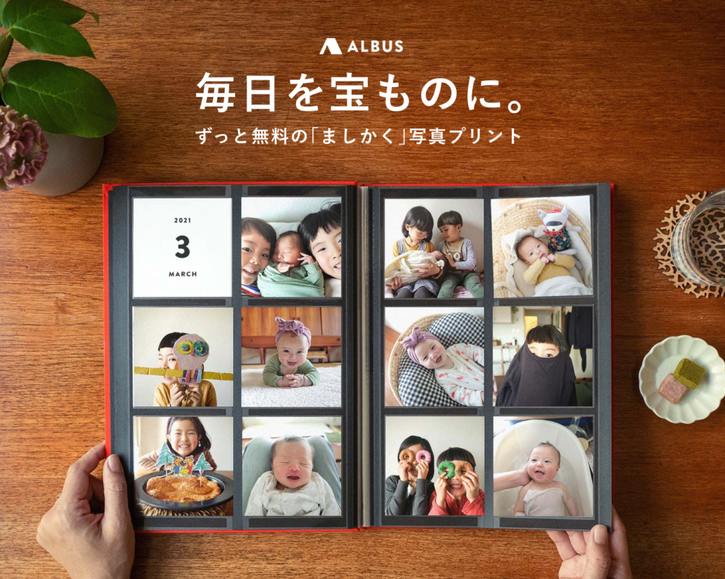 ALBUSは、子どもや家族の成長記録を残すのにぴったりの正方形プリントが魅力。毎月8枚まで無料(送料のみ)という圧倒的コスパで、忙しいママパパから熱烈な支持を受けています。