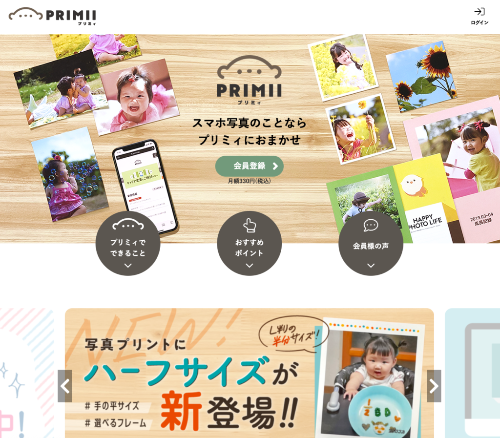 | プリミィ | 月額330円で30枚無料 | L判プリント | 月額制・検索機能あり | アルバム整理が楽 |