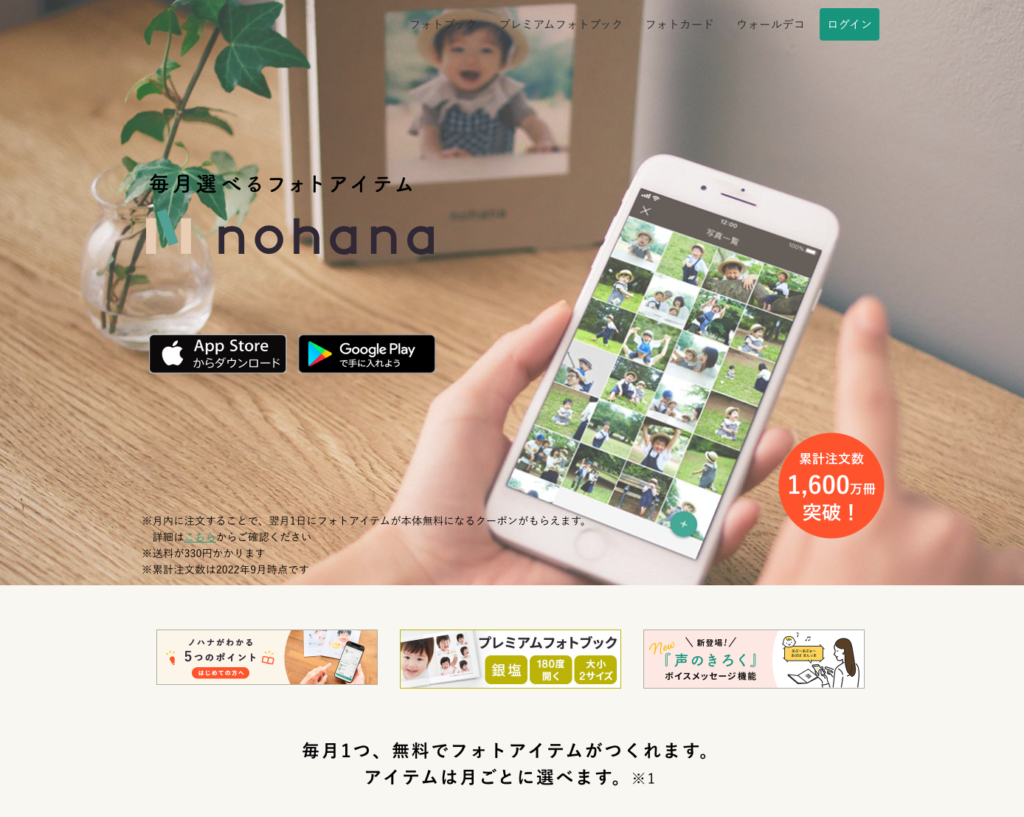 ノハナは、毎月1冊無料でフォトブックが作れるサービスです。子育て層に人気があり、操作も非常に簡単。毎月自動で通知が届くため、忘れずに思い出を形にできます。