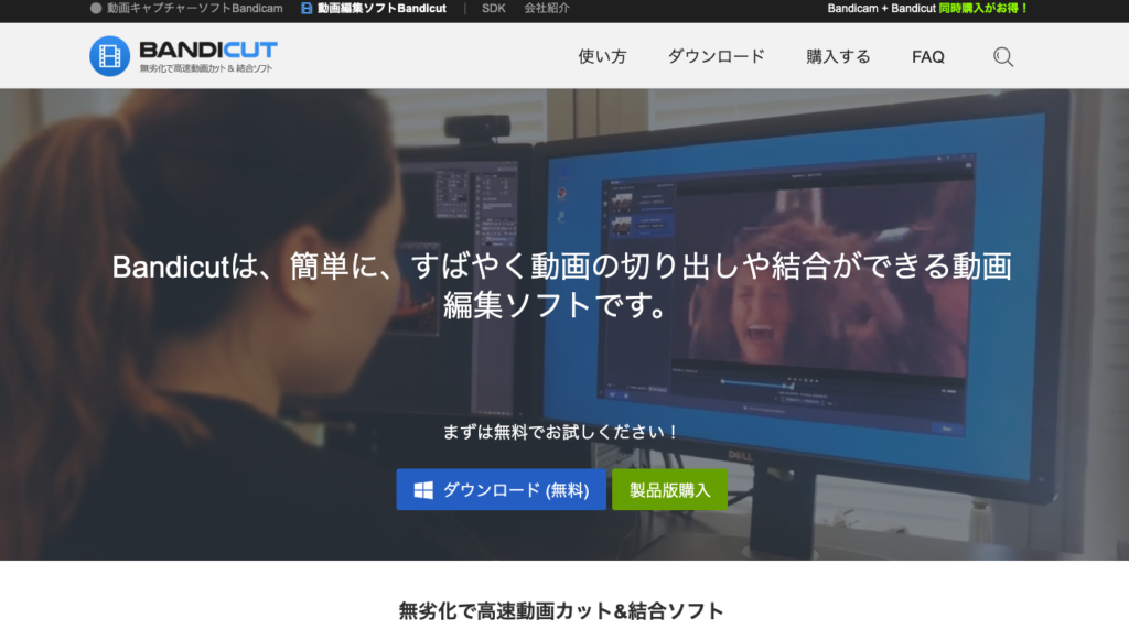Bandicutは、画面録画ソフトで有名な「Bandicam」を開発したBandicam Companyが提供する、動画のカット・結合に特化したソフトです。