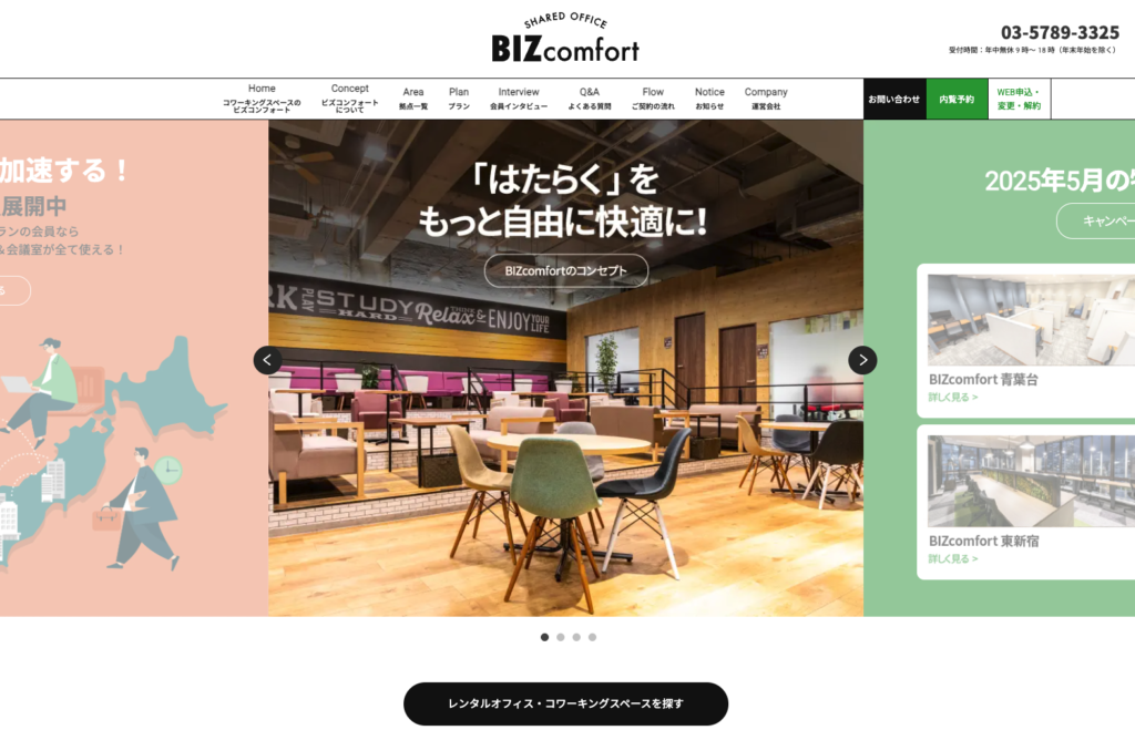 | BIZcomfort | 2,200円〜 | 拠点数最多、24時間利用、会議室完備 | 100拠点以上 | △(一部対応) |
