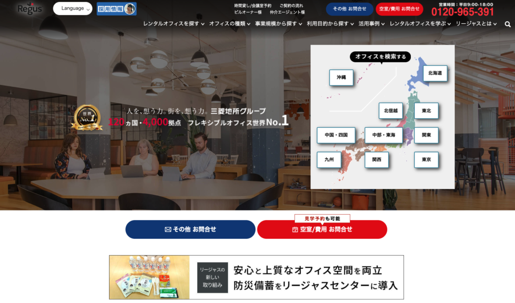 「Regus(リージャス)」は、世界120カ国以上・3,000拠点超を展開する老舗のシェアオフィスブランド。
