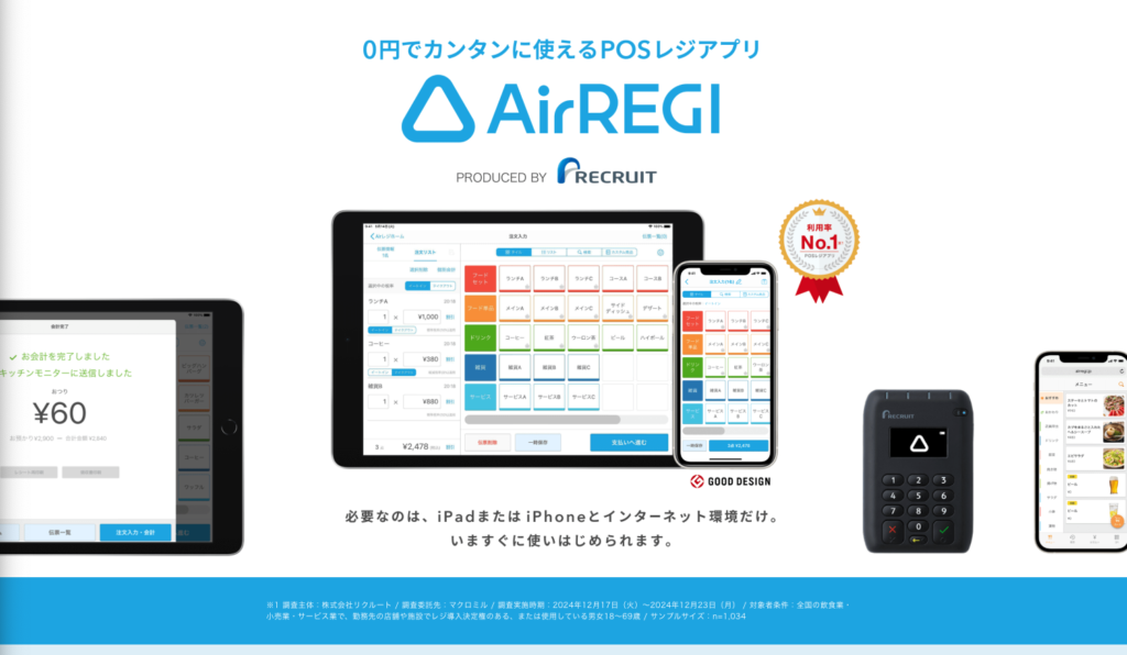 Airレジは、リクルートが提供するAndroidおよびiOS対応のクラウド型POSレジサービスで、シンプルな操作性と高い利便性から、多くの中小企業や個人事業主に支持されています。