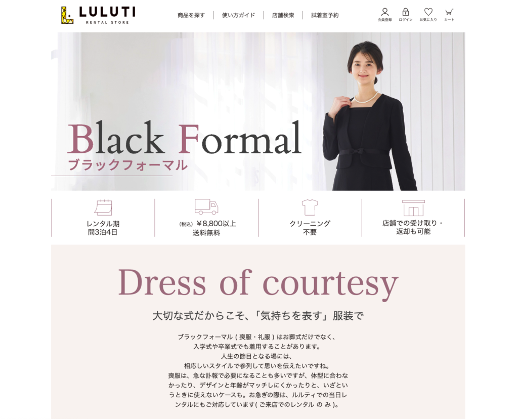 **LULUTI(ルルチ)は、女性専用の喪服・礼服レンタルサービスで、「できるだけ安く、でもしっかりしたものを借りたい」というニーズに応えるプランが揃っています。