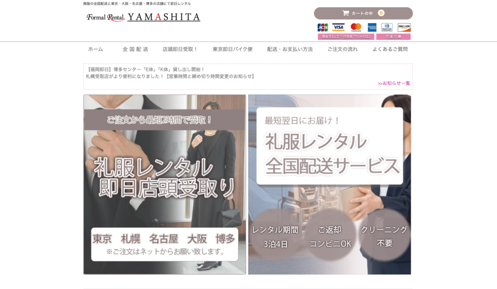 レンタルのやましたは、男性・女性両方に対応した喪服・礼服のオンラインレンタルサービスで、全国送料無料・分かりやすい料金設定が特長です。
