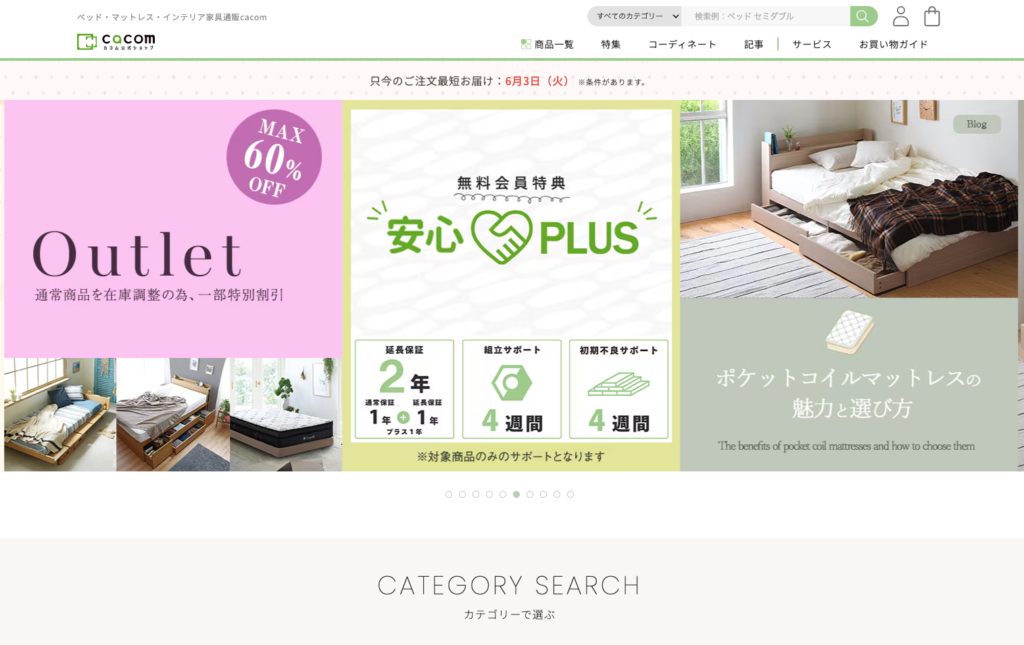また、サイズ別や部屋別での検索機能も優れており、目的のアイテムにたどり着きやすい工夫も光ります。配送は全国対応で、設置や組み立てサービス(有料)も充実。