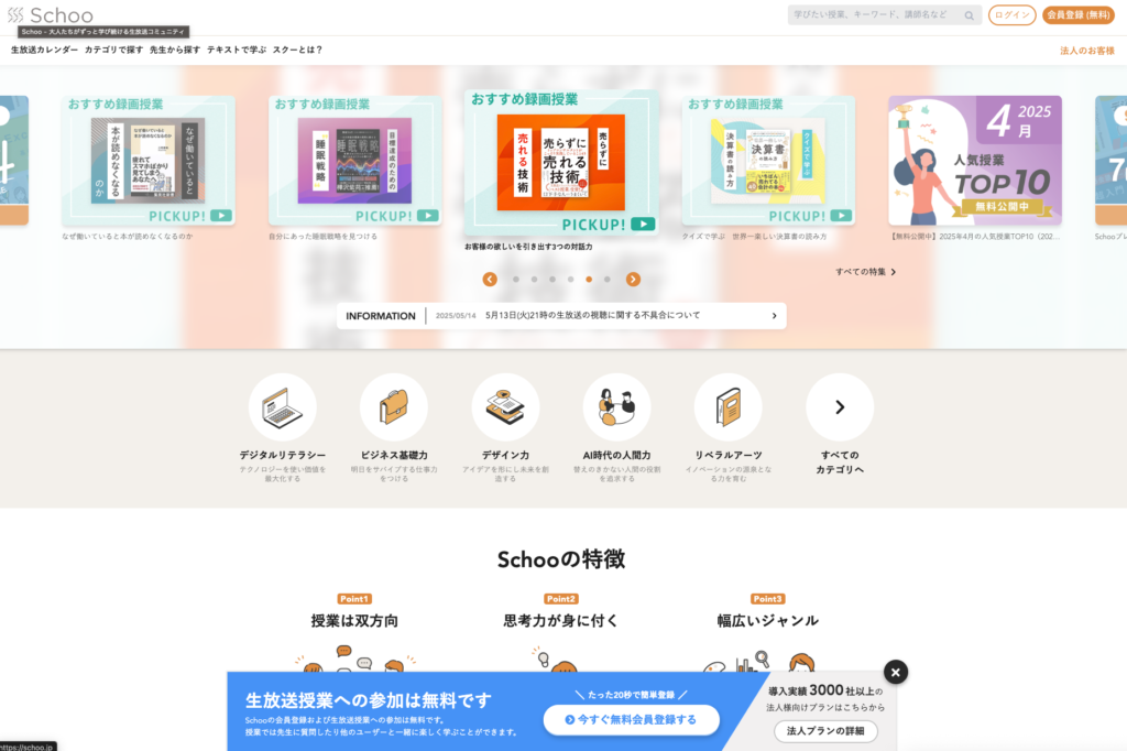 Schooは、ビジネススキルやITスキル、デザイン、ライフスタイルなど、多岐にわたる分野のオンライン講座を提供する学習プラットフォームです。ライブ授業と録画授業の両方を提供しており、リアルタイムでの学習や、自分のペースでの学習が可能です。また、企業向けの研修サービスも展開しており、多くの企業で導入されています。