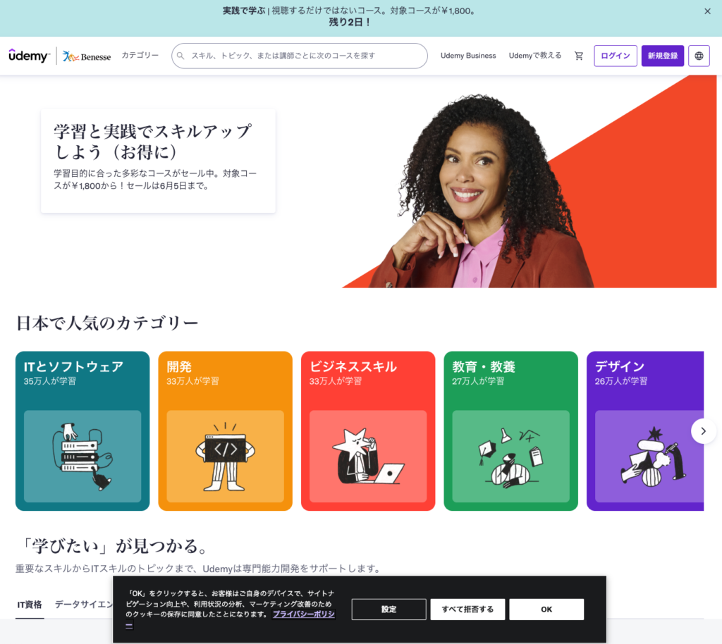 Udemyは、世界中の専門家が提供するオンライン講座を受講できるプラットフォームです。プログラミング、デザイン、ビジネス、マーケティングなど、多岐にわたる分野の講座が揃っており、自分のペースで学習できます。また、頻繁にセールが開催されており、手頃な価格で高品質な講座を受講できるのも魅力です。