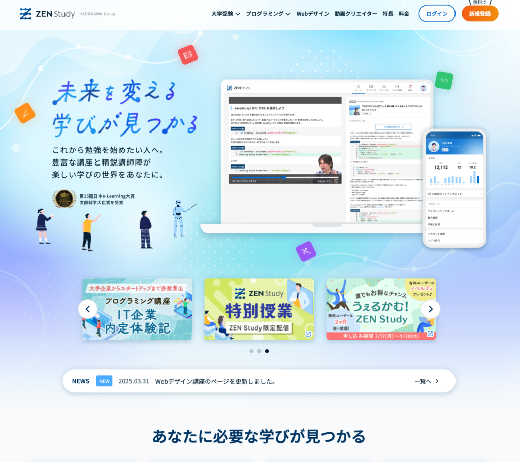 ZEN Study(旧N予備校)は、株式会社ドワンゴが提供するオンライン学習プラットフォームで、大学受験対策からプログラミング、Webデザイン、動画制作など、幅広い分野の講座を提供しています。特に、現役のエンジニアや専門家が講師を務める実践的なカリキュラムが特徴です。また、ライブ授業やQ&A機能を備えており、双方向の学習が可能です。