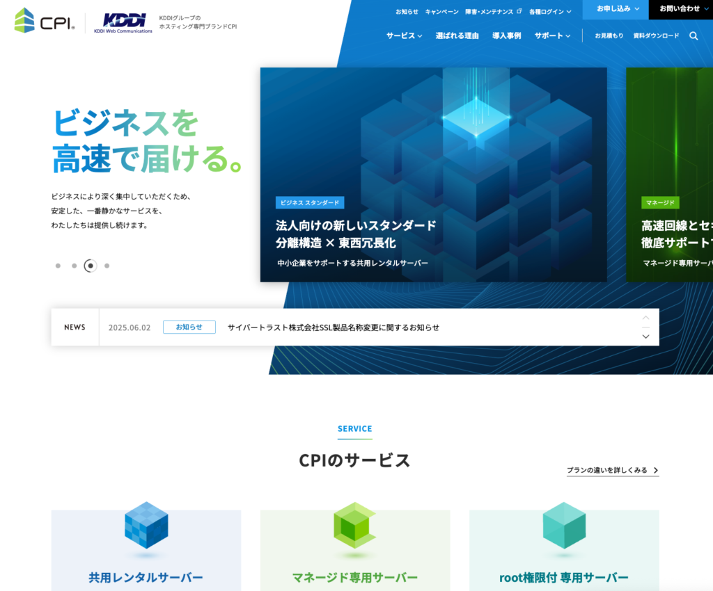 CPIは、KDDIグループによって提供される高信頼型レンタルサーバーであり、特に中〜大規模法人における商用サイトや業務システムのホスティングにおいて顕著な採用実績を持つ。特筆すべきは、その"ビジネススタンダード"プランが、共用サーバーに分類されながらも、専用ホスティング並の安定性・セキュリティ・管理性を提供している点にある。