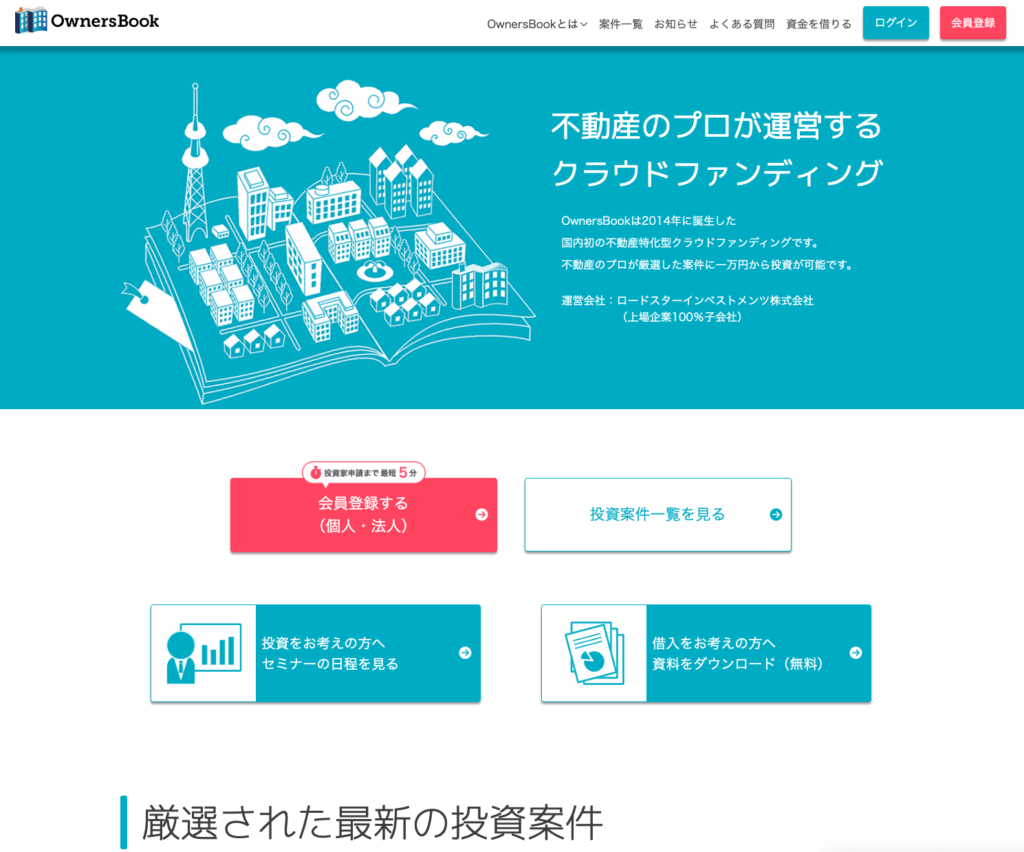 **OwnersBook(オーナーズブック)**は、東証上場企業のロードスターキャピタルが運営する不動産投資クラウドファンディングサービス。東京のオフィスビルや住宅を中心に、利回り重視の案件が多く揃っています。