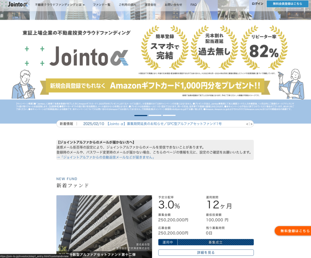 **Jointo α(ジョイントアルファ)**は、東証スタンダード市場に上場する「穴吹興産」が運営するクラウドファンディングサービスで、地方都市の優良物件への投資に力を入れています。1口10万円からと若干ハードルは高めですが、その分、厳選された案件と運営の堅実さが評価されています。