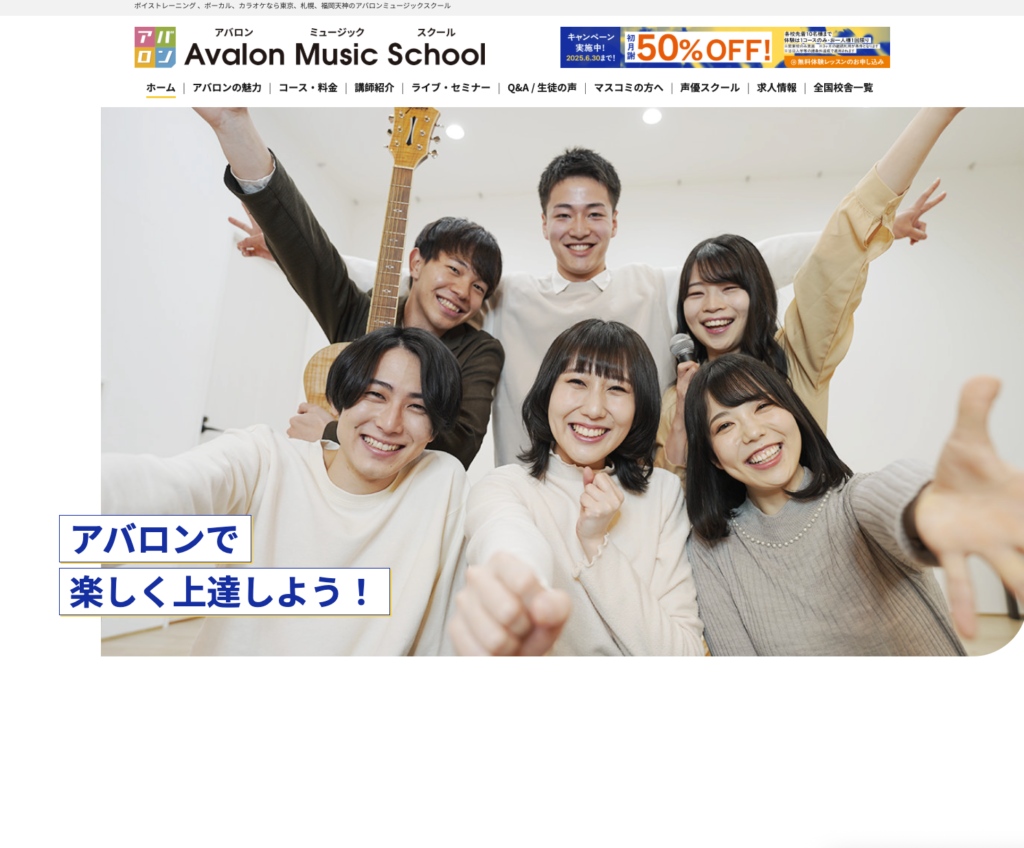 「アバロンミュージックスクール」は、音楽業界でも実績豊富なボイストレーナーが在籍する本格派スクールです。特に東京・神奈川を中心とした都市部に複数の校舎を構えつつ、オンラインレッスンも展開しているため、地域に関係なく受講可能。