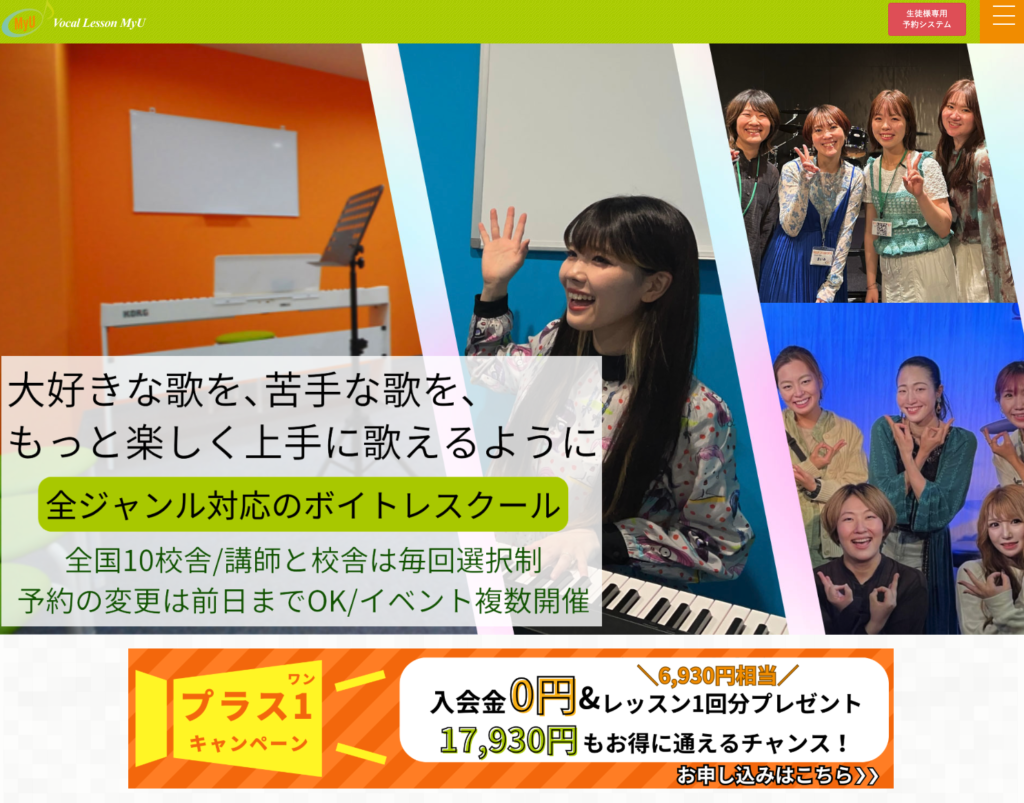 「ボーカルレッスン MyU(ミュウ)」は、完全マンツーマンの通学型レッスンをリーズナブルな価格で提供していることで知られています。首都圏を中心に校舎を展開しており、若者からシニアまで幅広い層に対応。