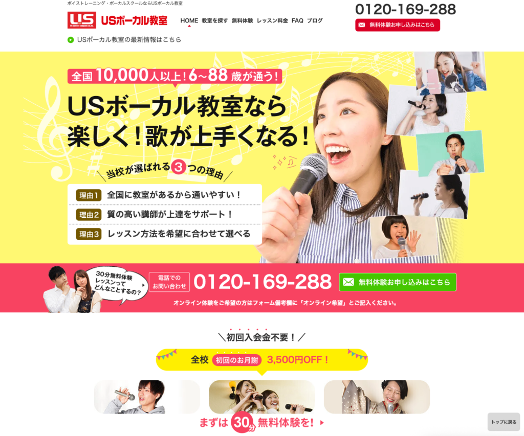 全国100校舎以上を展開するUSボーカル教室は、初心者歓迎の姿勢と安心の月謝制が魅力のボイトレスクールです。1996年設立という長い運営実績もあり、地域密着型で信頼性の高いスクールとして評価されています。