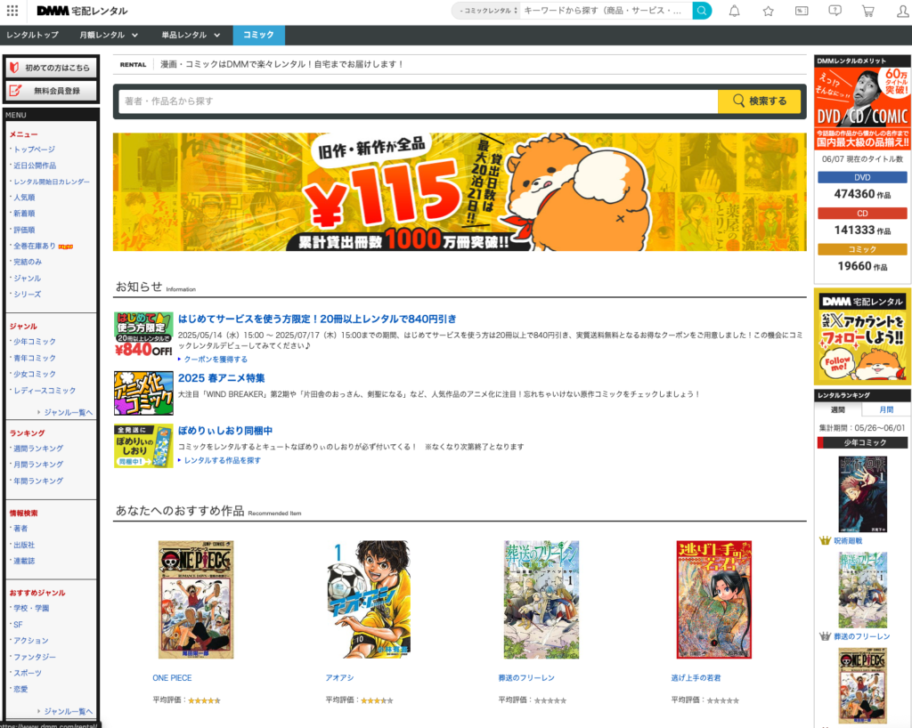 DMMコミックレンタルは、紙のコミックを自宅に届けてくれるサービス。1冊あたりわずか**115円(税込)〜**という圧倒的な安さが魅力。蔵書数は20万冊以上で、話題の新刊から往年の名作まで幅広く取り扱っています。