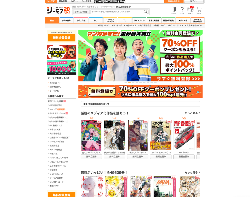 コミックシーモアは、NTTグループが運営する老舗の電子書籍サイト。特にマンガに強く、100万冊以上のコンテンツを提供。月額1,480円の「シーモア読み放題フル」は、7万冊以上が読めるお得なプランです。