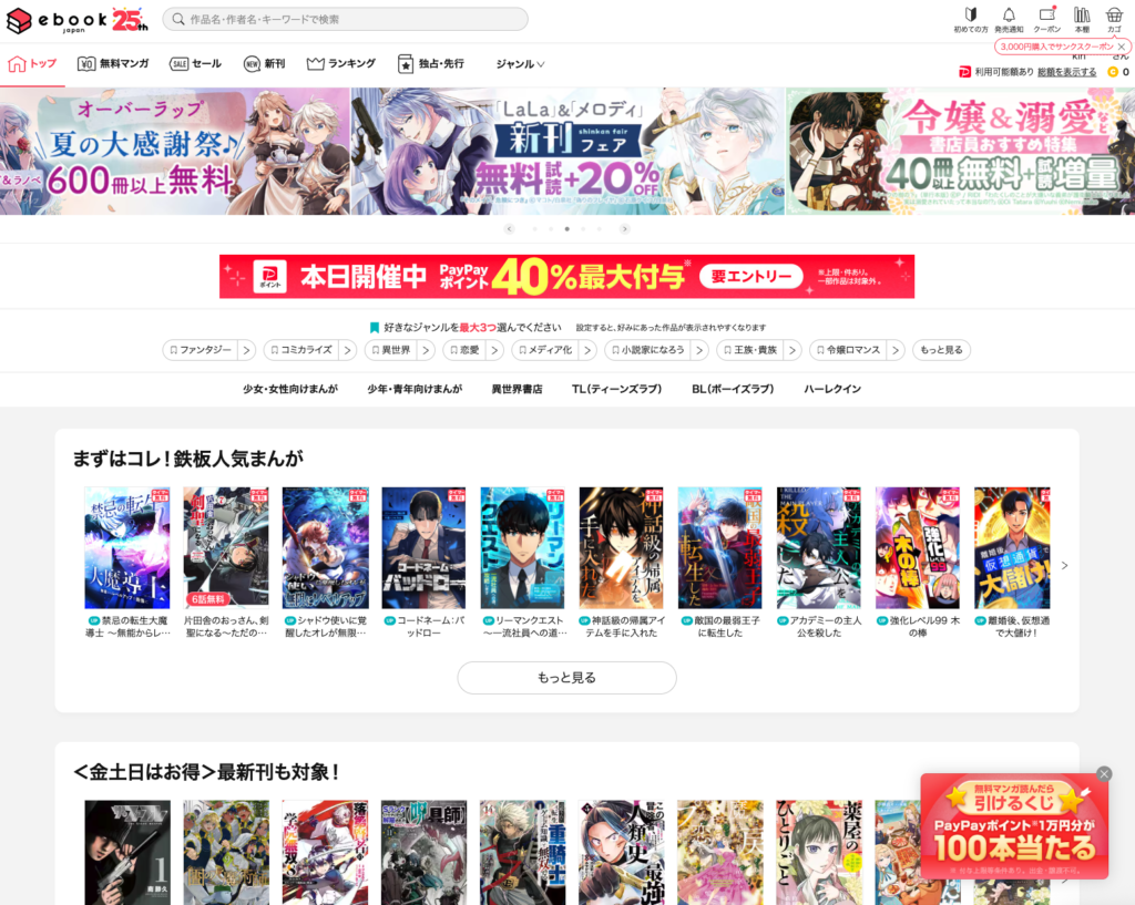 ebookjapanは、ヤフーと連携した電子書籍ストアで、特にPayPay連携によるポイント還元が圧倒的にお得。キャンペーンを活用すれば最大30〜50%還元も可能。