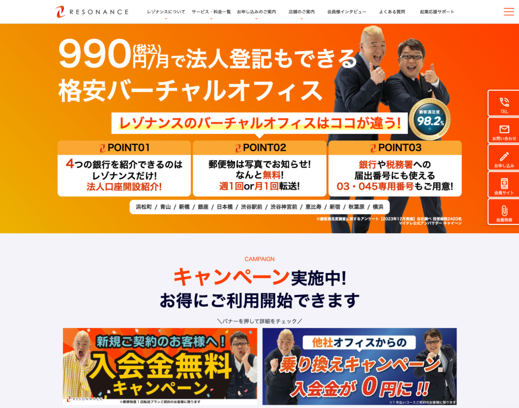 レゾナンスは、東京・銀座や渋谷といったビジネス価値の高いエリアに拠点を持ち、月額1,650円〜とリーズナブルな料金で法人登記が可能なバーチャルオフィスです。郵便物の受取・転送、電話転送や電話秘書といったサービスが充実しており、特にスタートアップや副業での起業に人気があります。