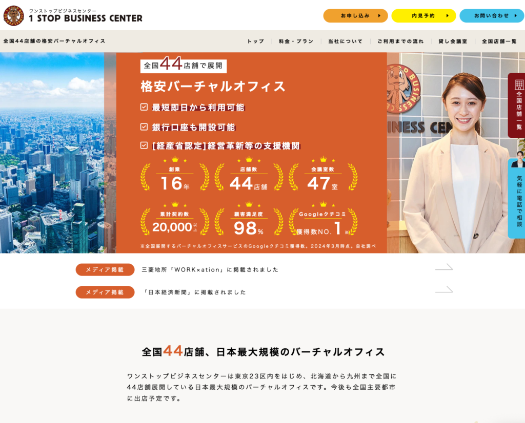 全国30拠点以上を展開し、豊富な運用実績を誇る「ワンストップビジネスセンター」は、柔軟な料金プランと対応力の高さが魅力のバーチャルオフィスです。東京・大阪・名古屋・福岡など主要都市にくわえ、地方都市にも対応しており、地域密着型の事業にも最適です。
