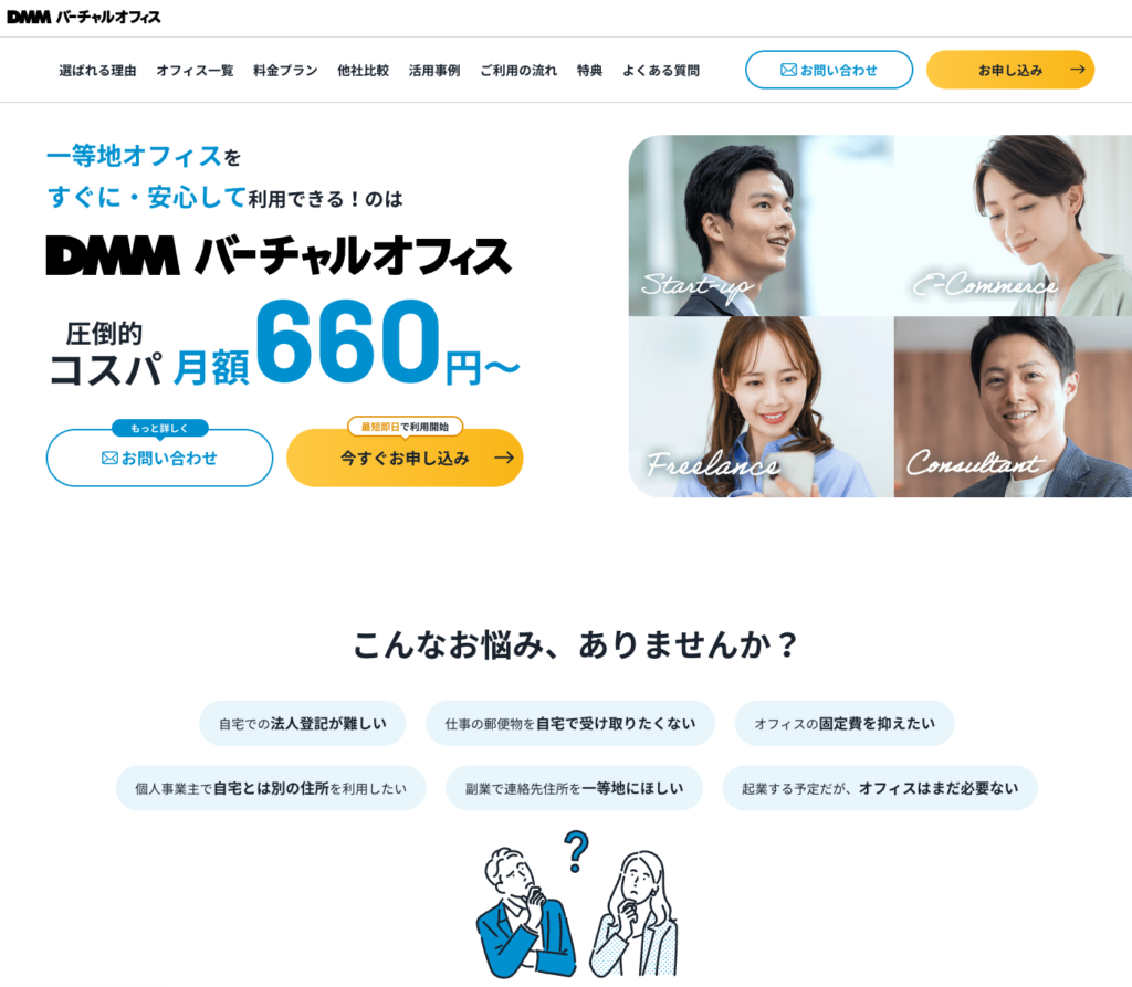 特に魅力的なのは、DMMグループが運営しているという安心感。個人での契約でも信頼を得やすく、名刺やHPへの住所掲載に対しての対外的な印象も非常に良好です。