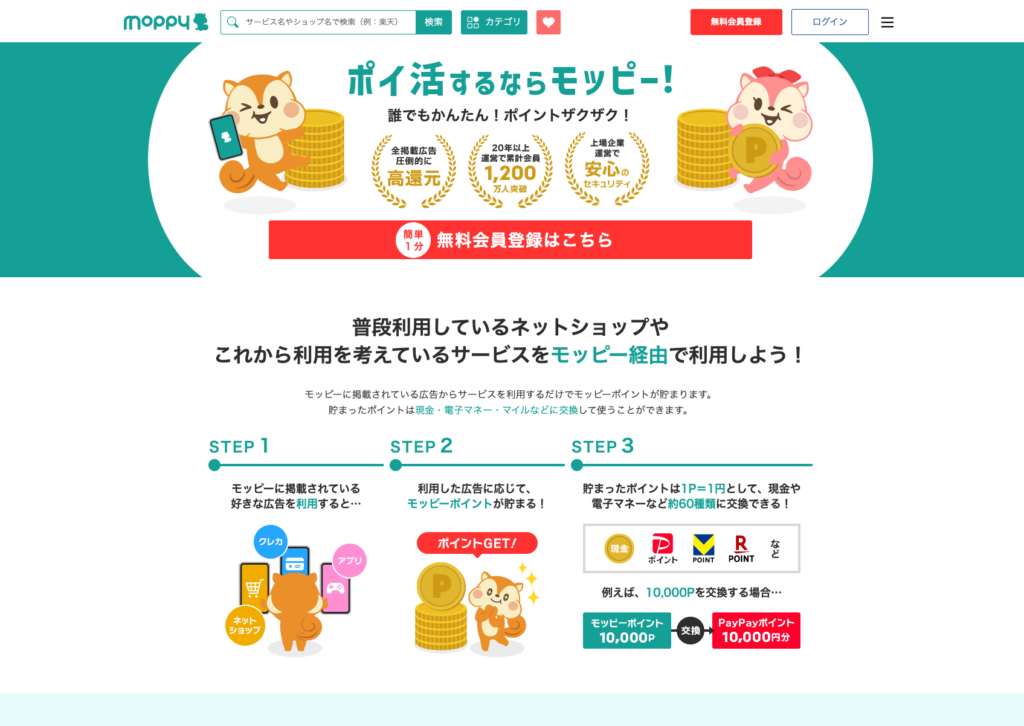 モッピーは若年層から主婦まで幅広い年代に人気のポイントサイトで、特にスマホユーザーにやさしい設計が魅力です。