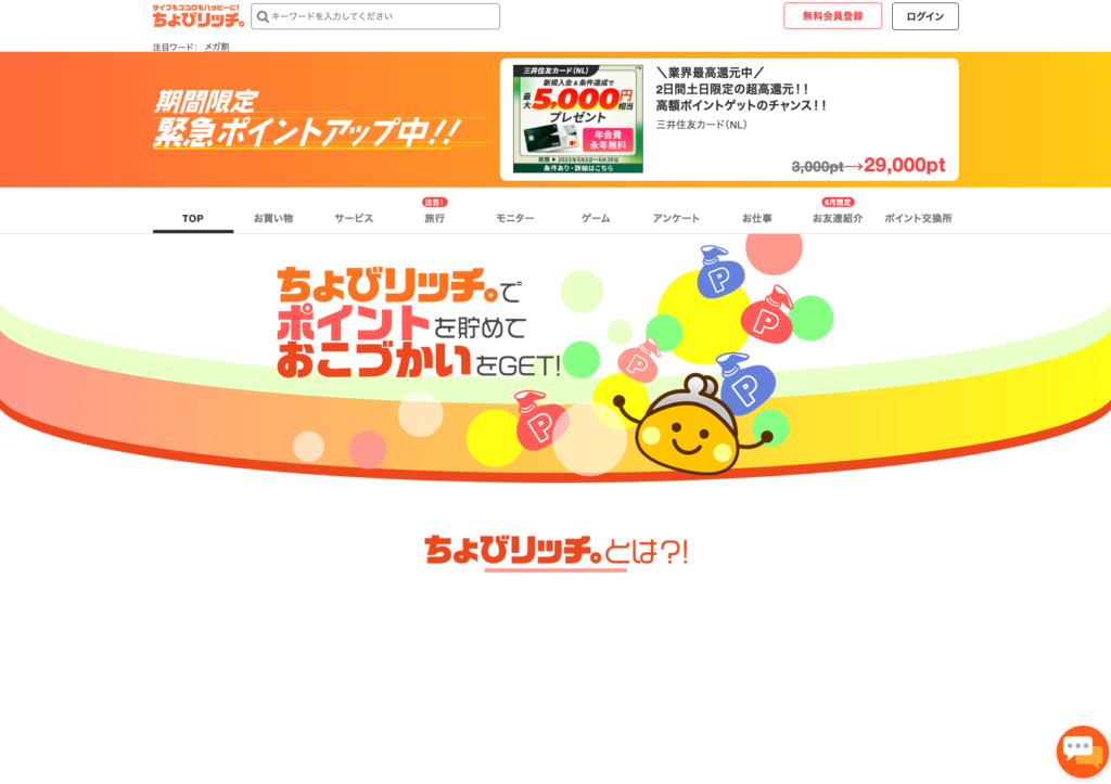 ちょびリッチは、広告利用やアンケートの他、ゲームやミニコンテンツなど“楽しみながら稼げる”要素が多く含まれたサイトです。