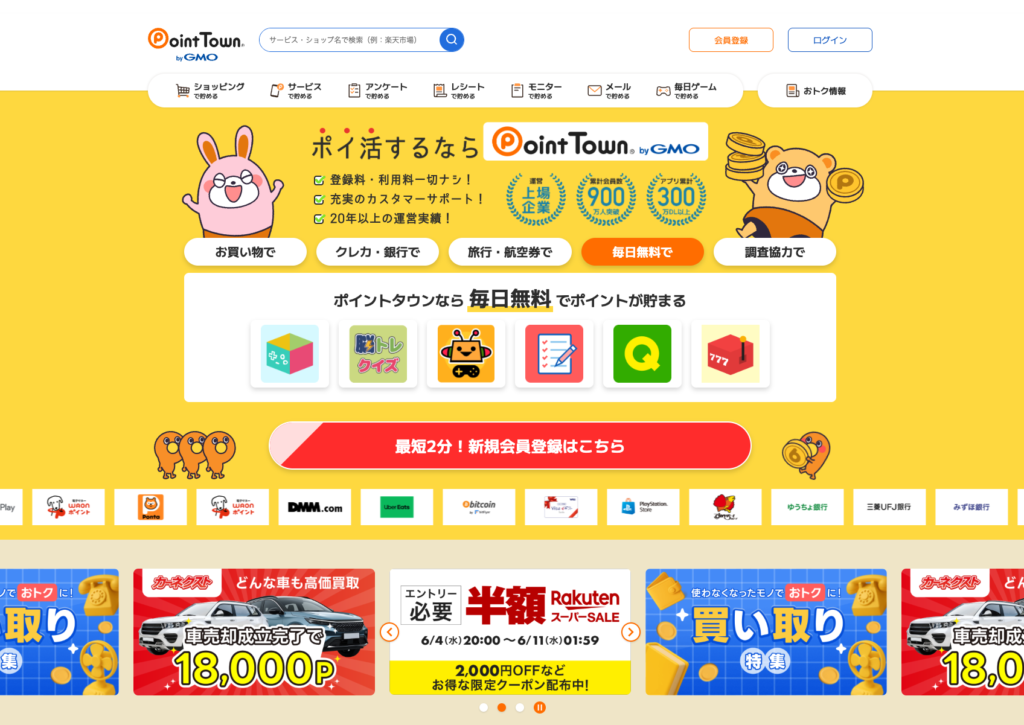 ポイントタウンはGMOグループが運営する信頼性の高いポイントサイト。特に“ショッピング案件”や“クレジットカード申込案件”の還元率に強みがあります。