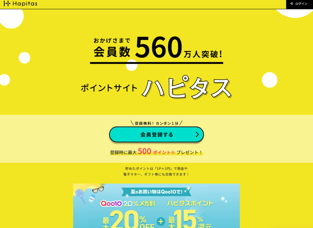 ユニークな点は、ポイントが2ポイント=1円の仕組みになっており、やや多く貯まったような感覚を楽しめる設計になっているところ。キャンペーンの頻度も高く、ポイントアップ案件やお得な特集が常時展開されています。