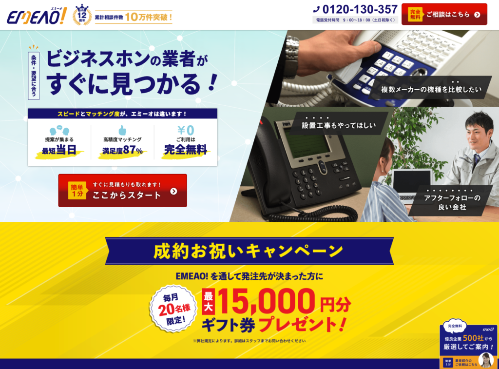 EMEAO!は、法人向けに特化した完全無料の業者マッチングサービスです。厳選されたビジネスホン業者から、最大8社まで一括見積もりを取得可能。中立的な立場からのサポートと、事前審査を通過した優良業者のみを紹介してくれる点が大きな魅力です。