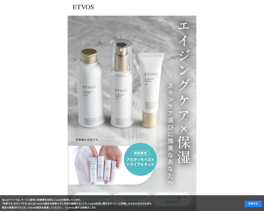| ETVOS | セラミド | 皮膚科医監修、高保湿で肌バリアを強化 | 3,520円〜 | ◯ 無香料・無着色・アルコールフリー |