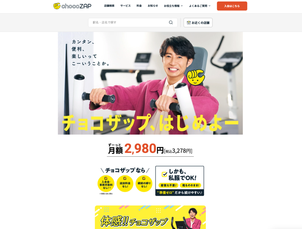**chocoZAP(チョコザップ)**は、あのRIZAPが手がける24時間フィットネスジム。運動初心者でも気軽に始められるように設計されており、「続けやすさ」が最大の魅力です。