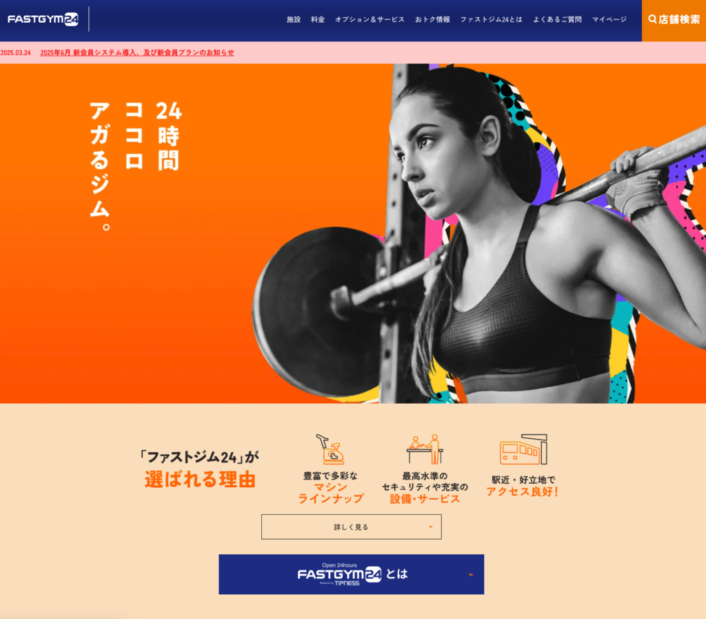 FASTGYM24は、フィットネスクラブ大手「ティップネス」が展開する24時間ジム。都市部を中心に展開しており、駅近で通いやすい立地が多いのが特徴です。