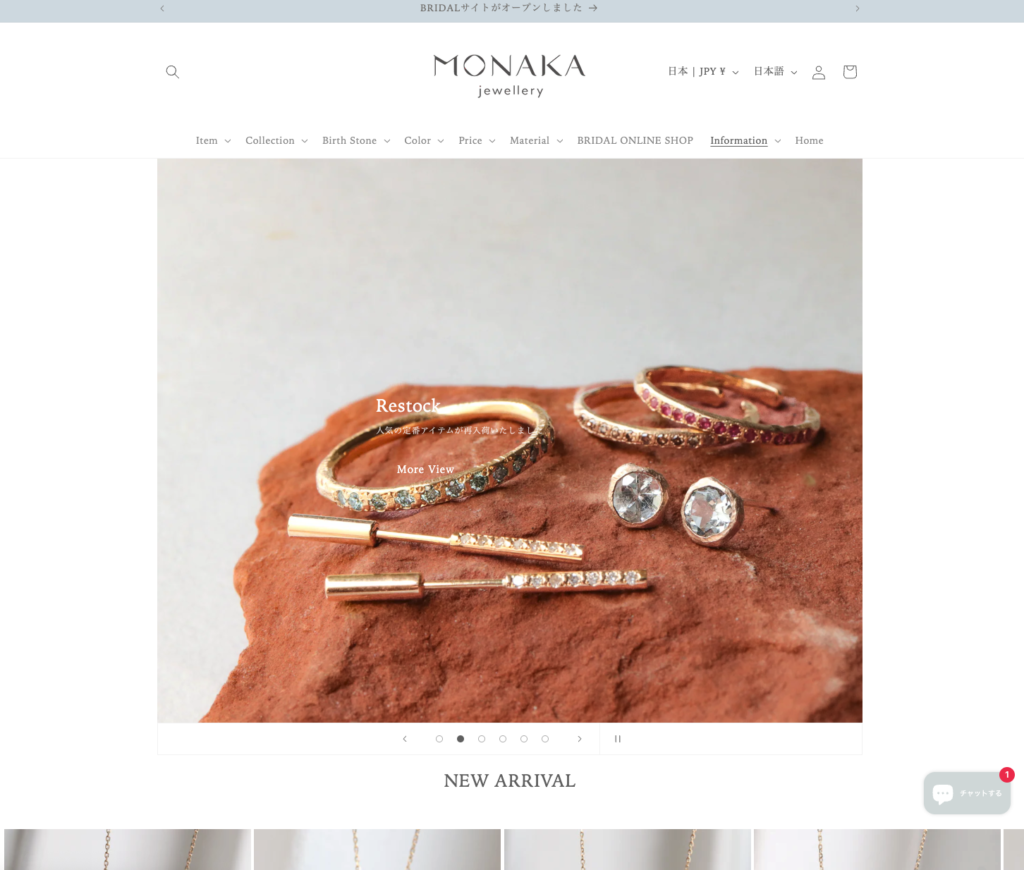 自然鉱石やカットの美しさを際立たせた繊細でアーティスティックなデザインが特徴のMONAKA。存在感がありながらも、どこか儚げな印象を持たせるジュエリーが魅力です。