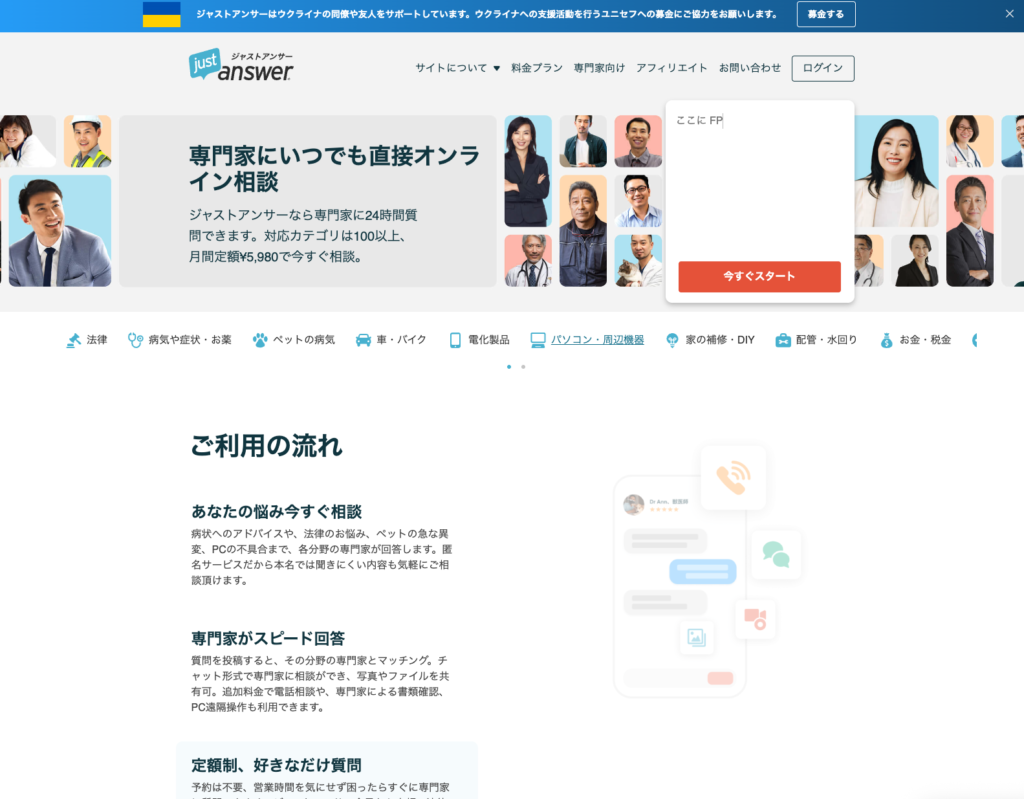 「専門家に質問できるQ&A型のサポート」として注目されているのが「ジャストアンサー」。月額制で24時間いつでもパソコンやスマートフォンのトラブルを相談できるのが特徴で、チャット型で専門家が対応するユニークなサービスです。