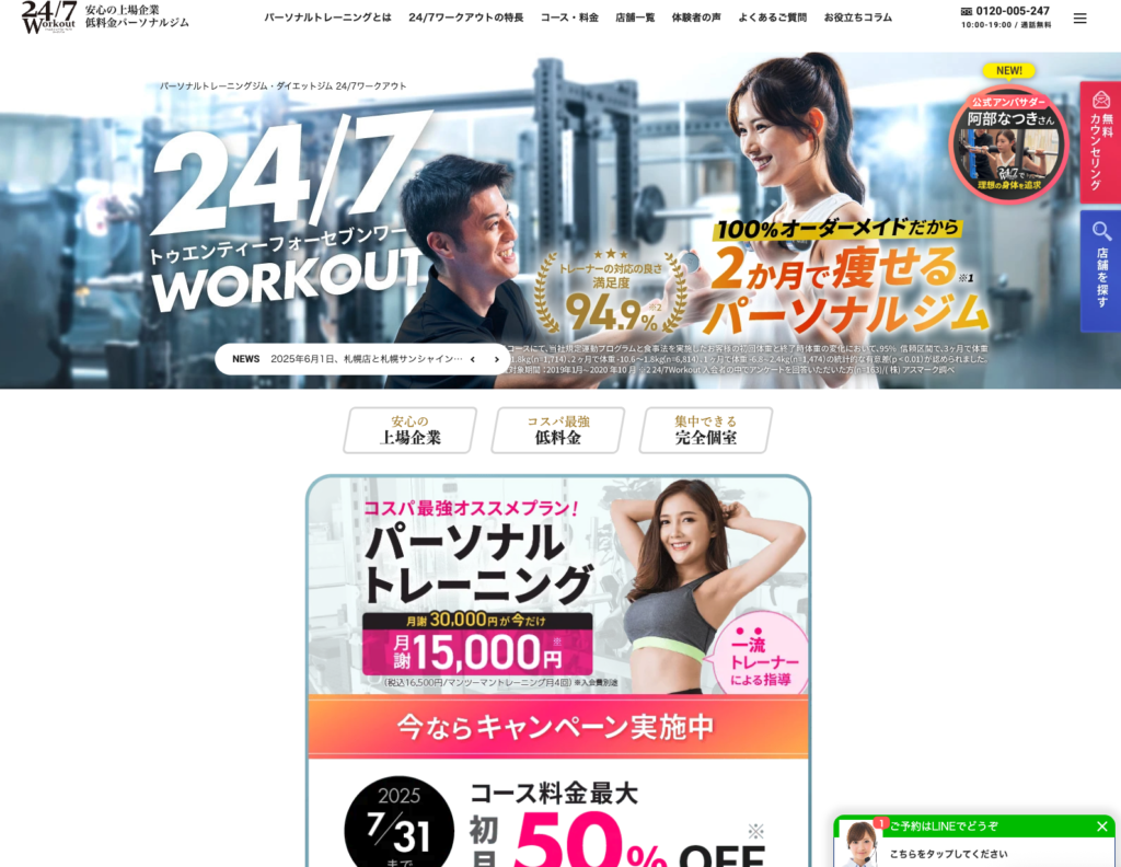 24/7ワークアウトは、完全個室・完全予約制のパーソナルジムとして、全国的に高い知名度を誇ります。2ヶ月で結果を出す短期集中プログラムが特徴で、時間のないビジネスパーソンにも人気。