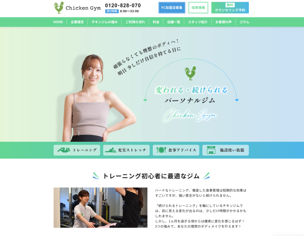 「運動が苦手な人こそパーソナルジムを」という理念のもと設立されたチキンジムは、初めてジムに通う方にこそおすすめ。筋トレだけでなく、ストレッチや体の歪み改善にも力を入れているのが特長です。